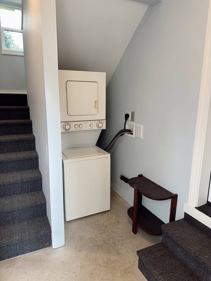 You enter through a side door with a central hallway. To the right is the main house up the stairs is the apartment. The apartment shares no walls with the main house and very little sound travels between the two. The washer dryer is dedicated to the unit and is located under the stairs as you enter the shared hallway. The washer dryer is NOT shared with the main house, it's all yours. The main house has it's own washer/dryer. There is a DETACHED private yard in the greater shared yard area for those with pets to provide off leash time to their pets.