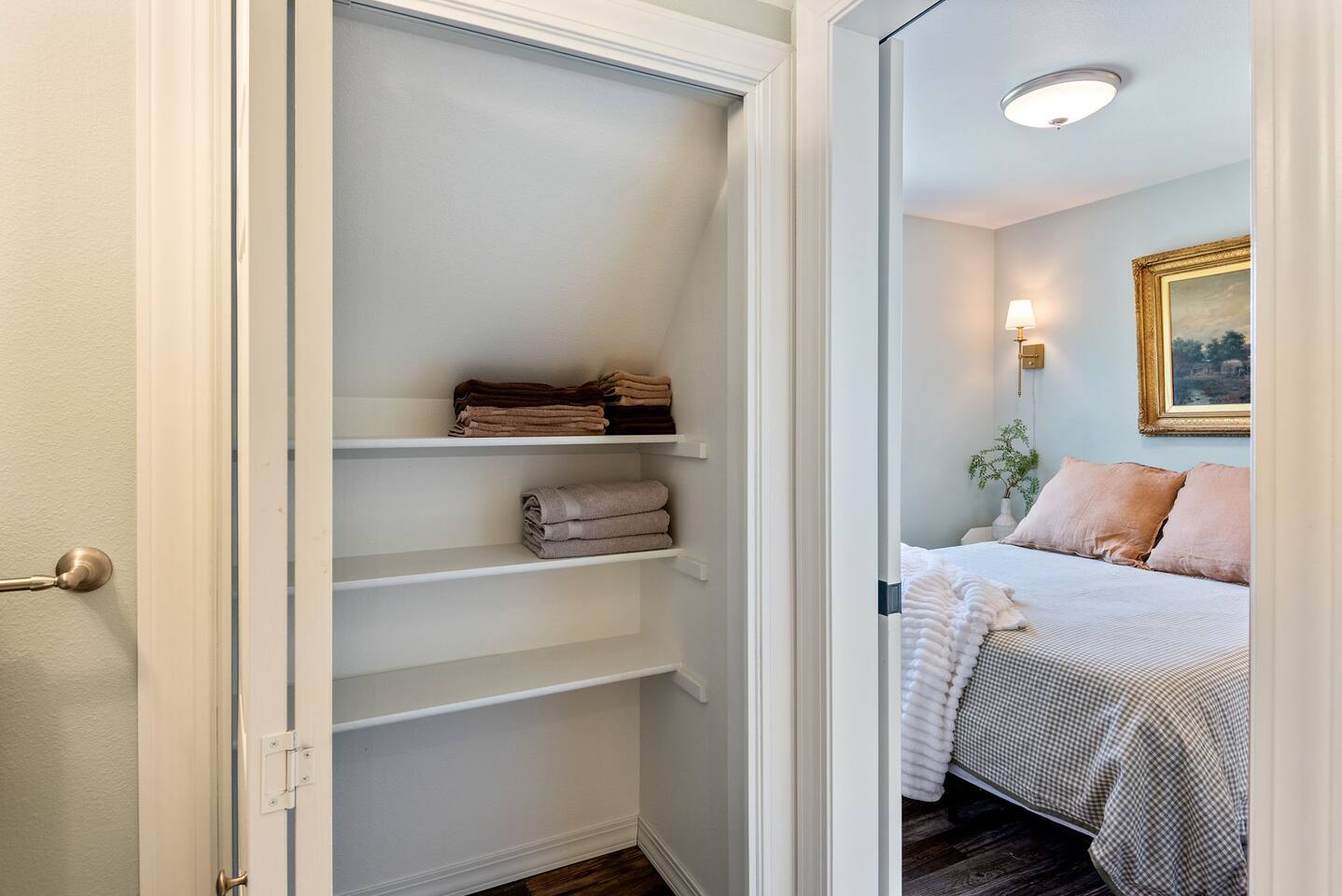 This is a shared property. The kitchen is fully equipped for basic cooking and cleaning and we start you off with basic paper products and cleaning products. Once those run out you're responsible for them. We do not provide detergent for washing clothes. There is 1 extra set of sheets and duvet's in the closet in the bathroom and the office is a large walk in closet that we converted to a small office!