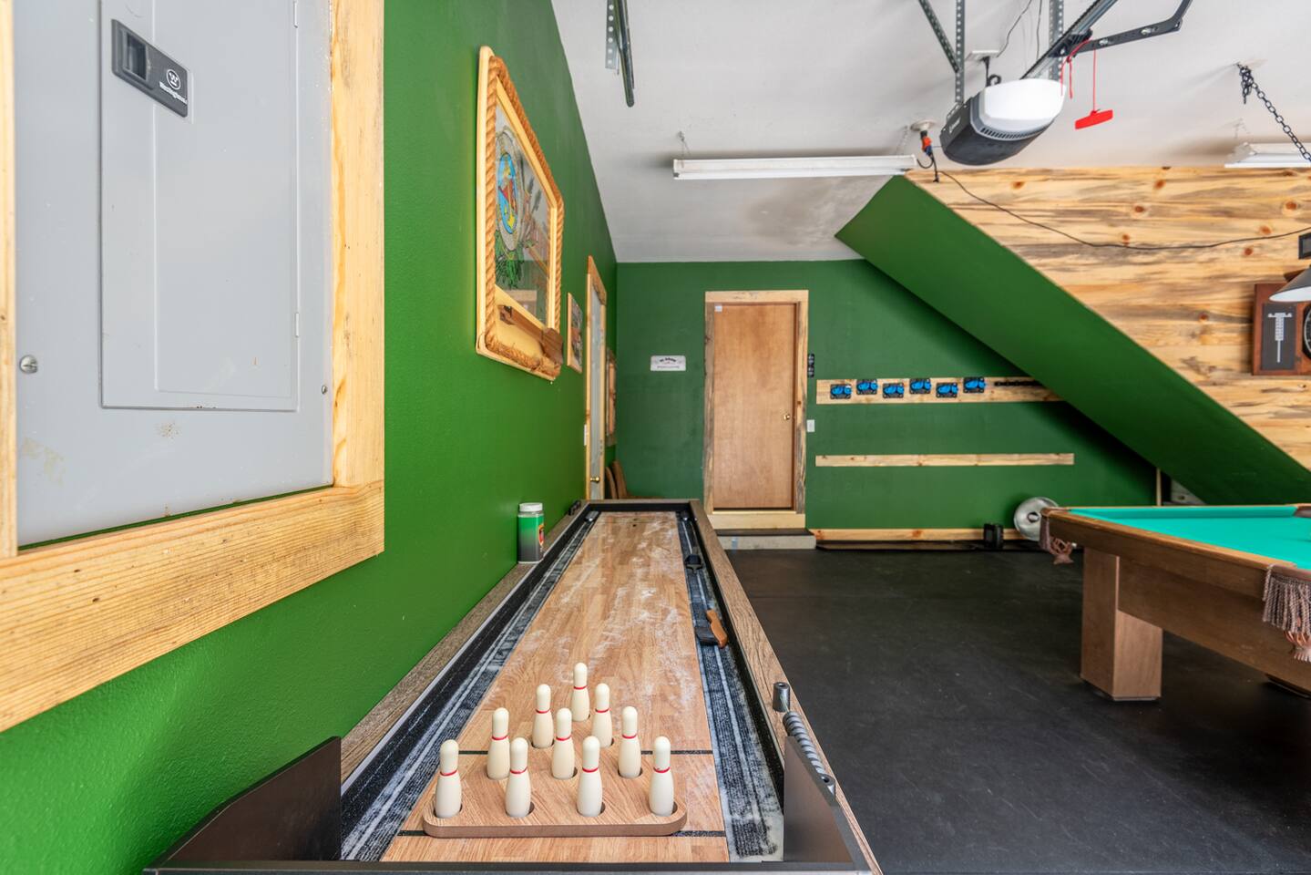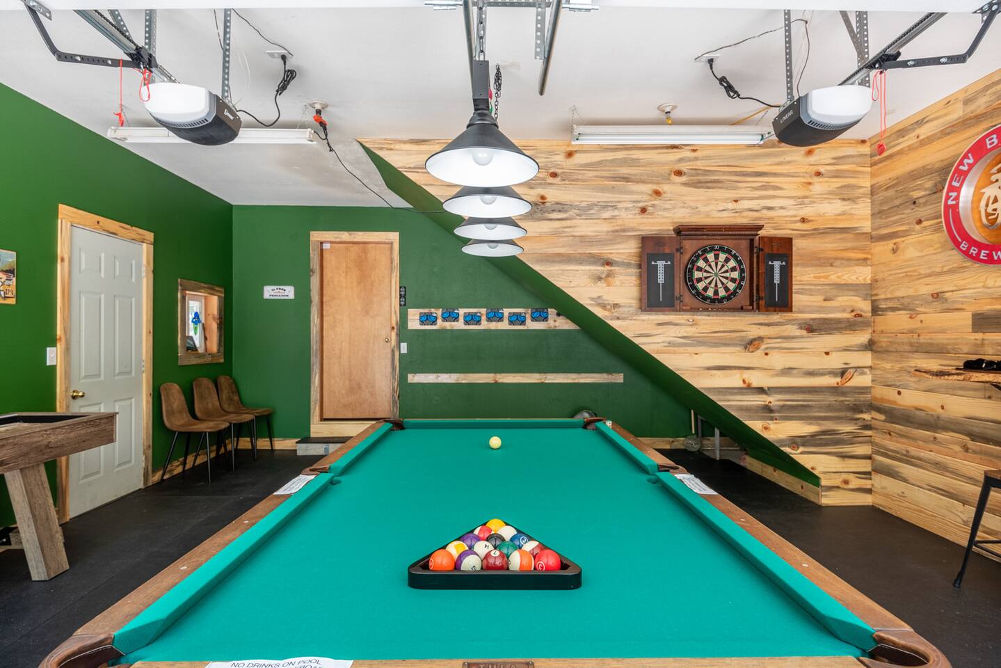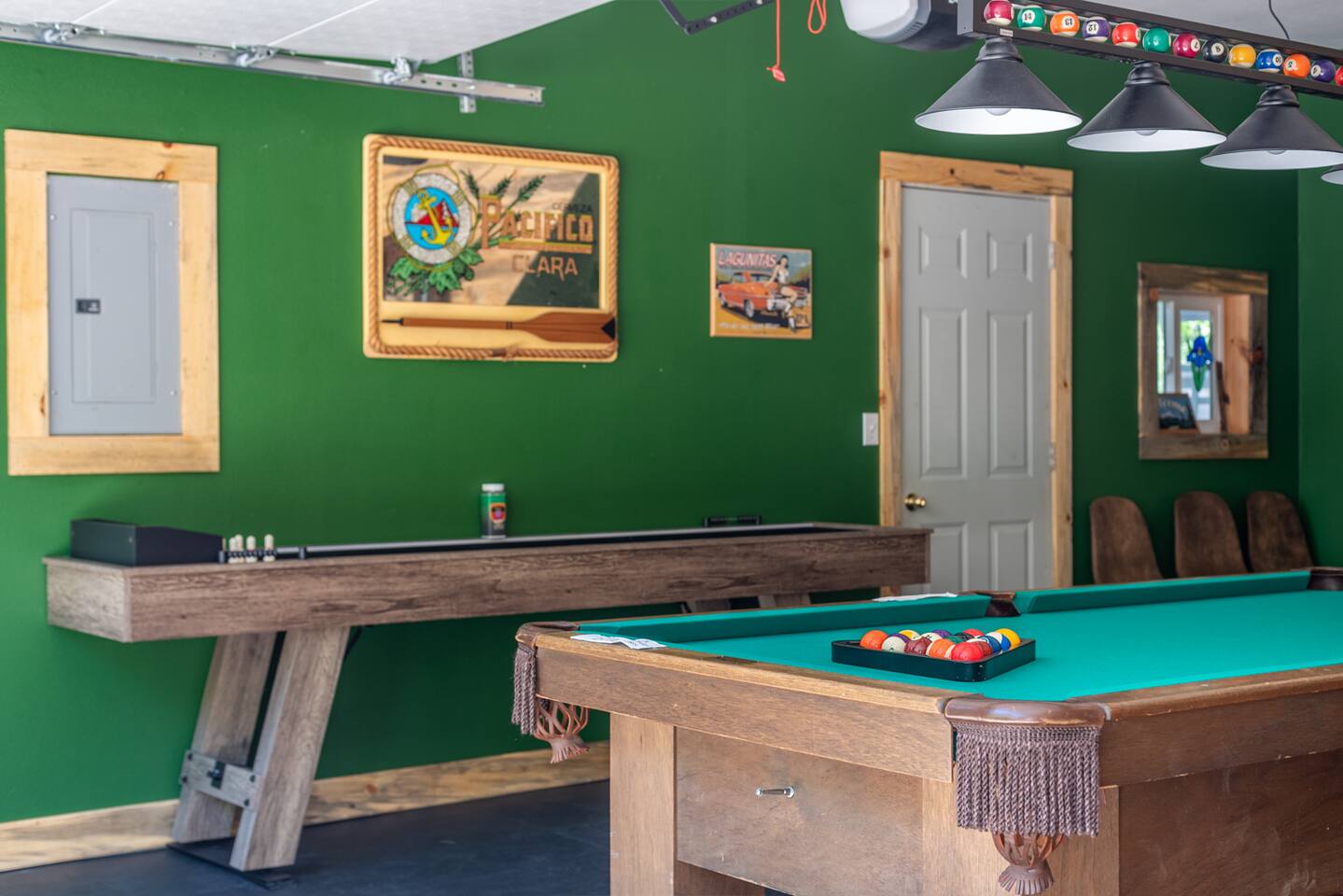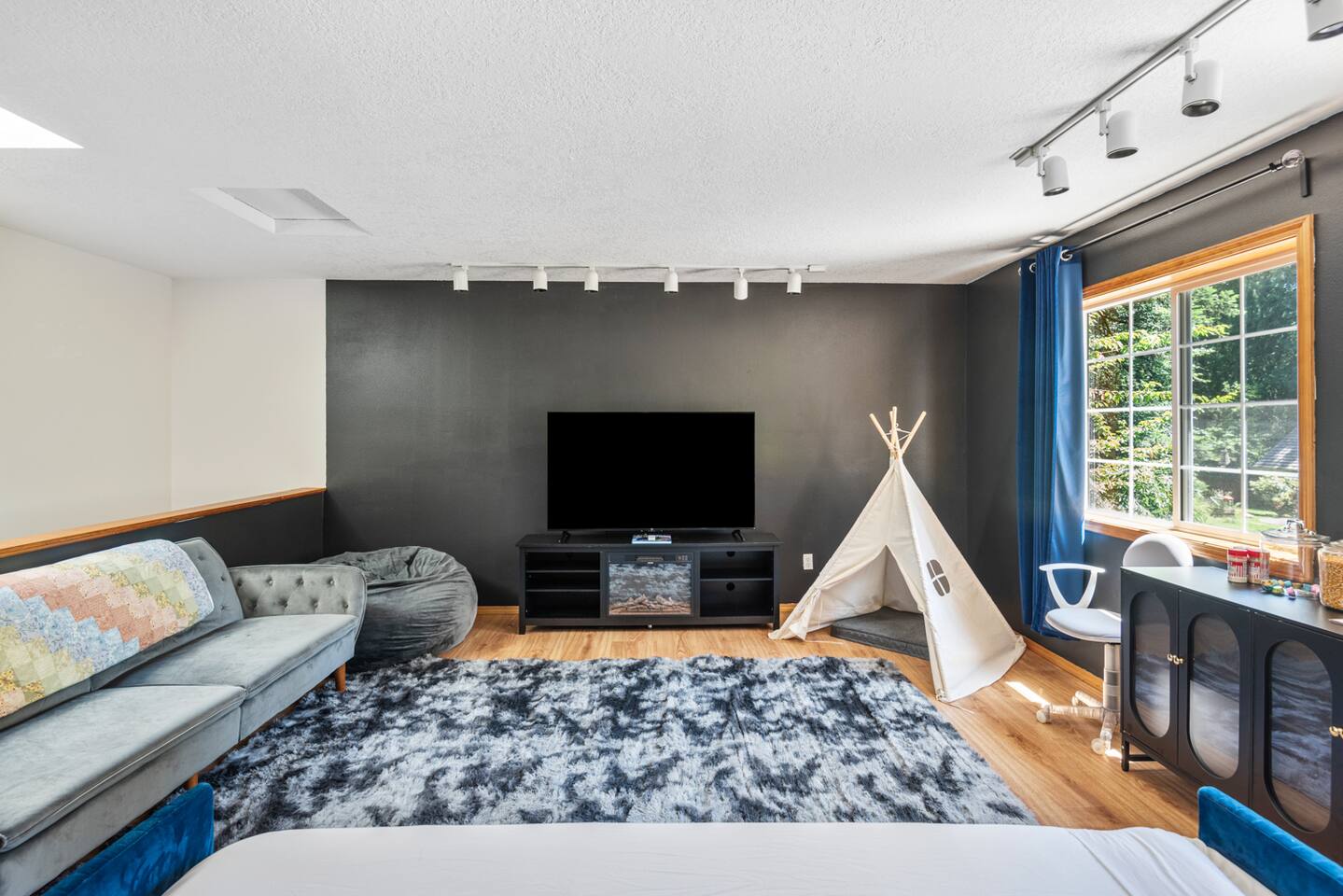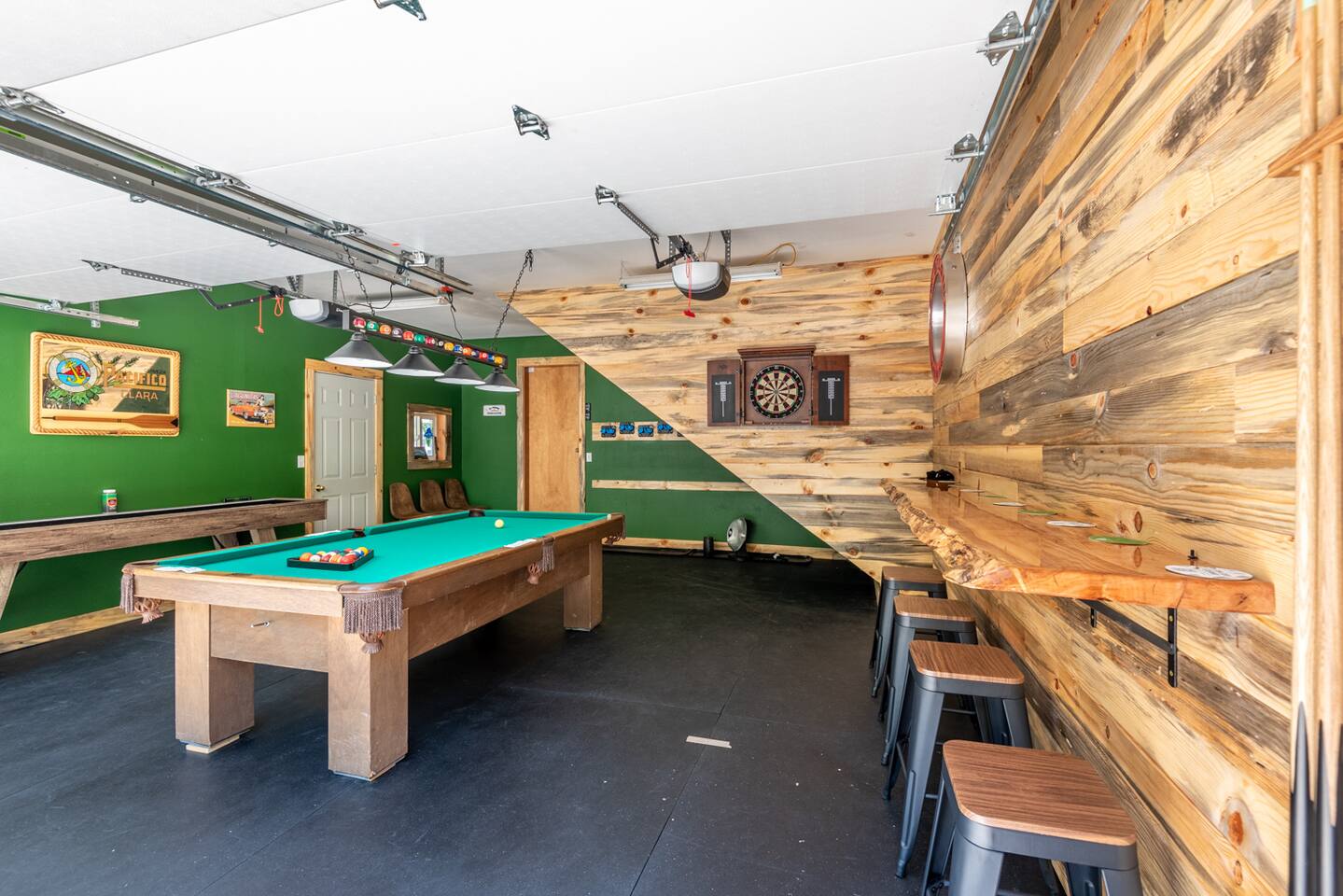 *3 Bedroom *2 Full Bathrooms - one family one ensuite *Move theater room with 65 inch TV, Popcorn Machine, day bed, trundle, futon sofa, and rollaway bed *Hot Tub *RV/ Boat Parking $40 extra per week (min $40/ stay) *Garage Converted to Game room and private bar! *Fenced back yard *Kid Friendly Features: Kids bunk room with toys and art materials, pack n play, high chair, baby/toddler utensils *AC (upstairs so there's a place to escape the heat on hot days! Ground Floor also has box fans in each room!) *Kitchen WELL EQUIPPED: French press Coffe mugs Plates bowls glasses roasting pans cookie sheets Mixing bowls kitchen aid mixer electric griddle full oven dishwasher large refrigerator ample wine glasses and bar-ware loads of pots and pans full spice rack olive oil salt and pepper Glass Tupperware Crockpot Dish Soap and sponges/scrubbers Paper Towels, seran wrap, foil Dishwasher pods Laundry room: full sized washer dryer top load side by side Large laundry sink Extra flashlights and lanterns are stored here Brooms Iron + Ironing board (located to side of WD) Bathrooms: Shampoo and conditioner Hand soap Washcloths Multiple towels (we're not stingy with them!) Toilet Paper Extra Toothbrushes- because someone always forgets one! Bedrooms: Each Room should be equipped with an extra set of linens and pillows just in case! Luggage racks Hangers Closets with storage and shelves TWO king Bedrooms one with ensuite one without Bunk room with twin and queen bunk, play kitchen, kids toys, games and built in desk/workstation Box Fans for air circulation/ white noise during warm months Living Area: Large leather couch Two reclining chairs Fireplace Smart TV Smart Fan Sliding doors that open to deck Open concept to kitchen/ dining room Game Room Bar: Pool table Dart board Bar with Bar Stools Shuffleboard Boot and Board Rack for Snowboards/skis Outside: Fenced yard Deck wrap around bench on deck Outdoor furniture Gas Grill HOT TUB Parking: Driveway has parking for 3 cars sided by side, there is a space for RVs boats or you could park some cars back to front and likely fit a total of 5 cars in the driveway. We prefer guests to avoid street parking